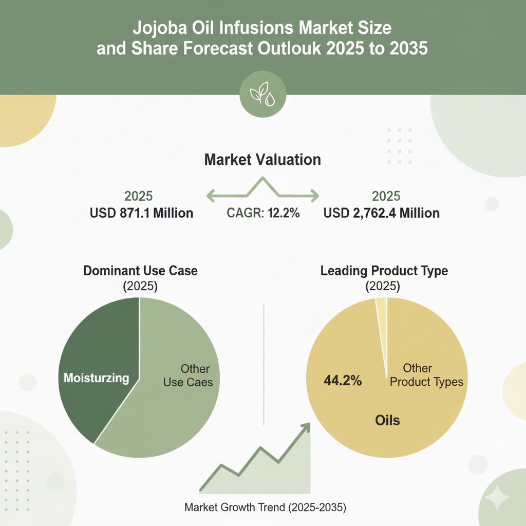 NEWARK, DE, UNITED STATES, October 23, 2025 /EINPresswire.com/ -- The global jojoba oil infusions market is experiencing transformative growth with Europe emerging as a strategic innovation and quality benchmark region, driving clean-label adoption, sustainability standards, and regulatory excellence that are reshaping competitive dynamics worldwide. With the market valued at USD 871.1 million in 2025 and projected to reach USD 2,762.4 million by 2035, representing a compound annual growth rate of 12.2% and more than 2X market expansion, European markets demonstrate sophisticated consumer preferences anchored by dermatological credibility, transparent sourcing practices, and eco-conscious packaging requirements.